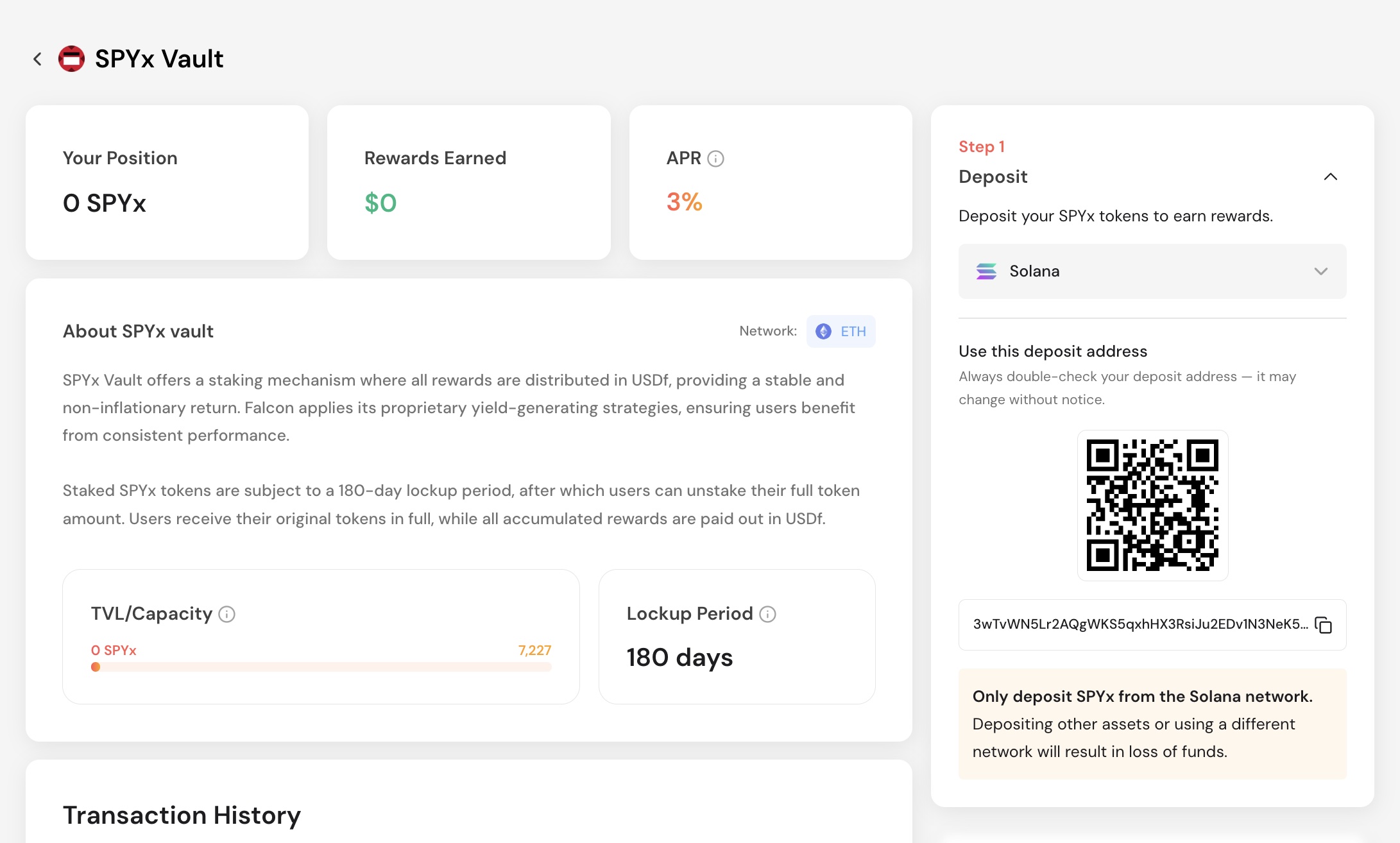To participate in the SPYx staking vault, first connect a Web3 wallet with your SPYx tokens to the Falcon Finance app. After connecting, the vault’s page displays a dedicated Solana deposit address where you need to transfer SPYx tokens. Once the funds arrive, the deposit is recognized and the position is staked. You can monitor your principal on the Portfolio page.